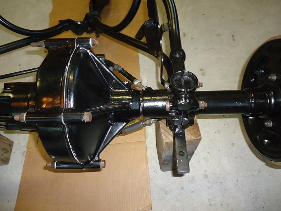 Early Servi-car axles (1934 to 1936) have a big center, with a single mechanical drum brake inside the housing. This brake has two shoes and is internal-expanding on a fixed pivot. A parking brake is mounted inside the rear axle housing.